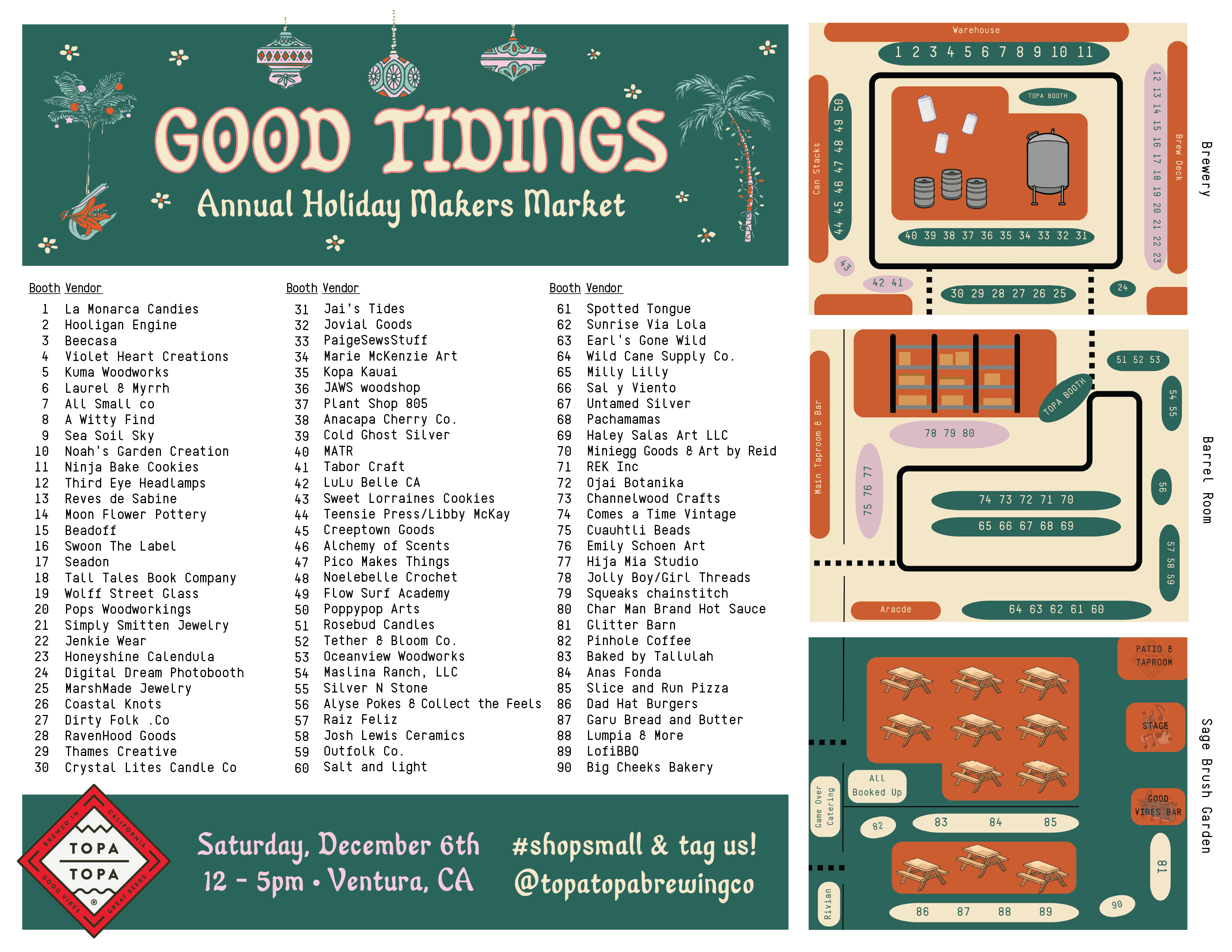 Enjoy good vibes and great beers at our annual curated holiday marketplace, featuring our largest vendor gathering yet! This family- and pet-friendly event features 80+ local, Ventura-based makers and merchants, delectable treats, new Topa Topa merchandise releases, live music, workshops, plenty of fresh beers & more.